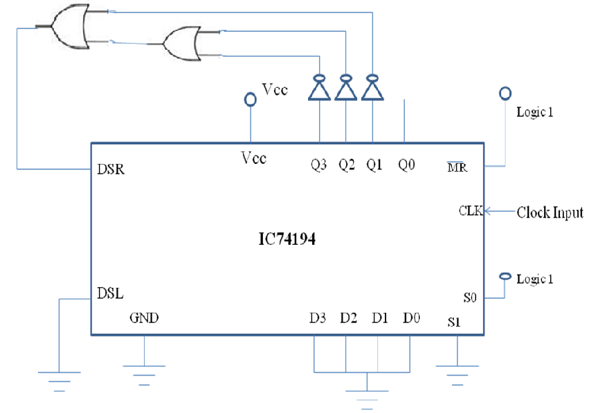 Design and implement pulse train generator using IC74HC194 for pulse 111001 (Use left shift)