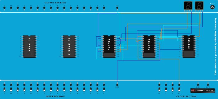 - Connect Seven segment display 2 to Pin-19 (Output) of ICBase-3 (74LS76).