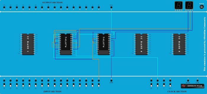 - Connect Seven segment display 1 to Pin-14 (Output) of ICBase-2 (74LS76).