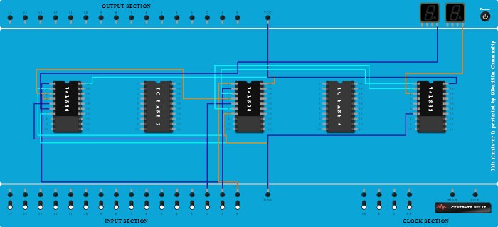 - Connect Seven segment display 2 to Pin-6 (Output) of ICBase-1 (74LS86).
