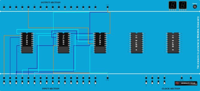 - Connect Pin-5 (Input) of ICBase-3 (74LS86) to Pin-1 (Output) of ICBase-1 (74LS02).