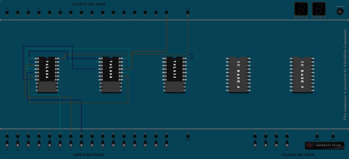 - Connect Pin-16 (Input) of ICBase-2 (74LS08) to Pin-4 (Output) of ICBase-1 (74LS04).