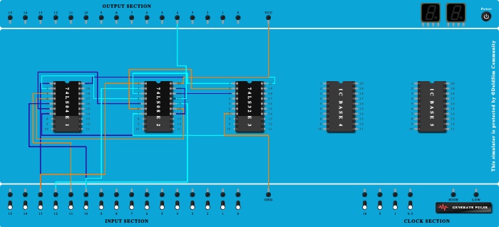 - Connect Pin-15 (Input) of ICBase-2 (74LS08) to Pin-4 (Output) of ICBase-1 (74LS04).