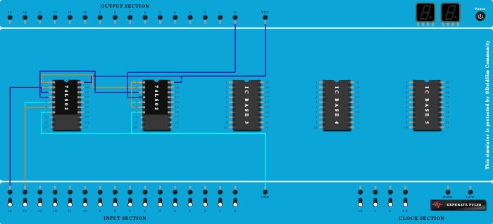 - Connect Pin-3 (Input) of ICBase-2 (74LS02) to Pin-4 (Output) of ICBase-1 (74LS02).