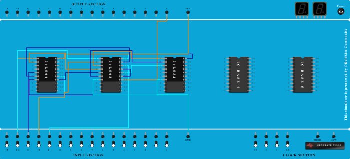 - Connect Pin-3 (Output) of ICBase-3 (74LS32) to Pin-16 (Input) of ICBase-2 (74LS08).