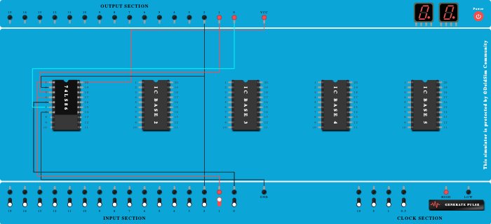 - Connect Output-0 to Pin-6 (Output) of ICBase-1 (74LS86).
