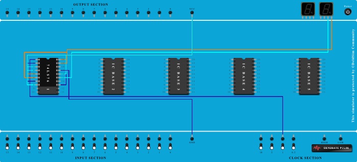 - Connect Seven segment display 1 to Pin-19 (Output) of ICBase-1 (74LS76).